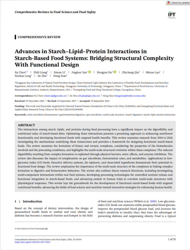 2025年11月,禁闻网 朱杰教授团队在国际食品Top期刊《Comprehensive Reviews in Food Science and Food Safety》(Q1,IF:14.1)发表题为“Advances in Starch–Lipid–Protein Interactions in Starch-Based Food Systems: Bridging Structural Complexity With Functional Design”的封面综述文章。陈旭副教授为论文第一作者和通讯作者,朱杰教授、肖航教授为共同通讯作者。该成果为陈旭副教授在美国马萨诸塞大学阿...
